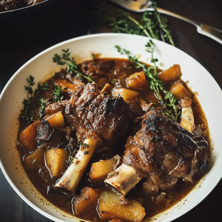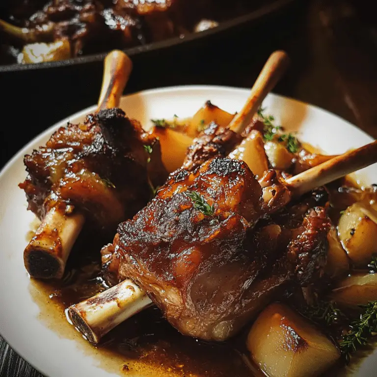 Apple Cider Braised Lamb Shanks are a decadent and comforting dish that brings together tender, fall-off-the-bone meat with a beautifully balanced sweet-tangy sauce. Braised low and slow in a mix of apple cider, garlic, herbs, and aromatic vegetables, the lamb absorbs all the rich flavors, resulting in a succulent, deeply satisfying meal with a touch of fruity elegance.