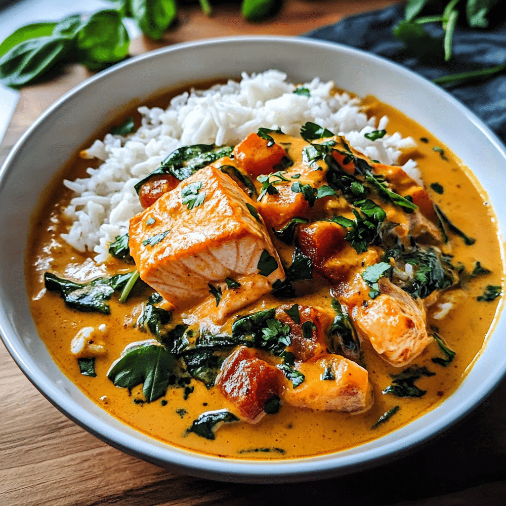 Easy 30-Minute Coconut Salmon Curry is a flavorful, creamy, and comforting dish that’s perfect for a quick weeknight dinner. This recipe combines tender salmon fillets with a rich coconut curry sauce infused with aromatic spices like garlic, ginger, turmeric, and red curry paste. The creamy coconut milk balances the heat and adds a luscious texture, while fresh lime juice and herbs like cilantro or basil provide a bright, refreshing finish. Serve it over steamed rice or with naan to soak up all the delicious sauce.